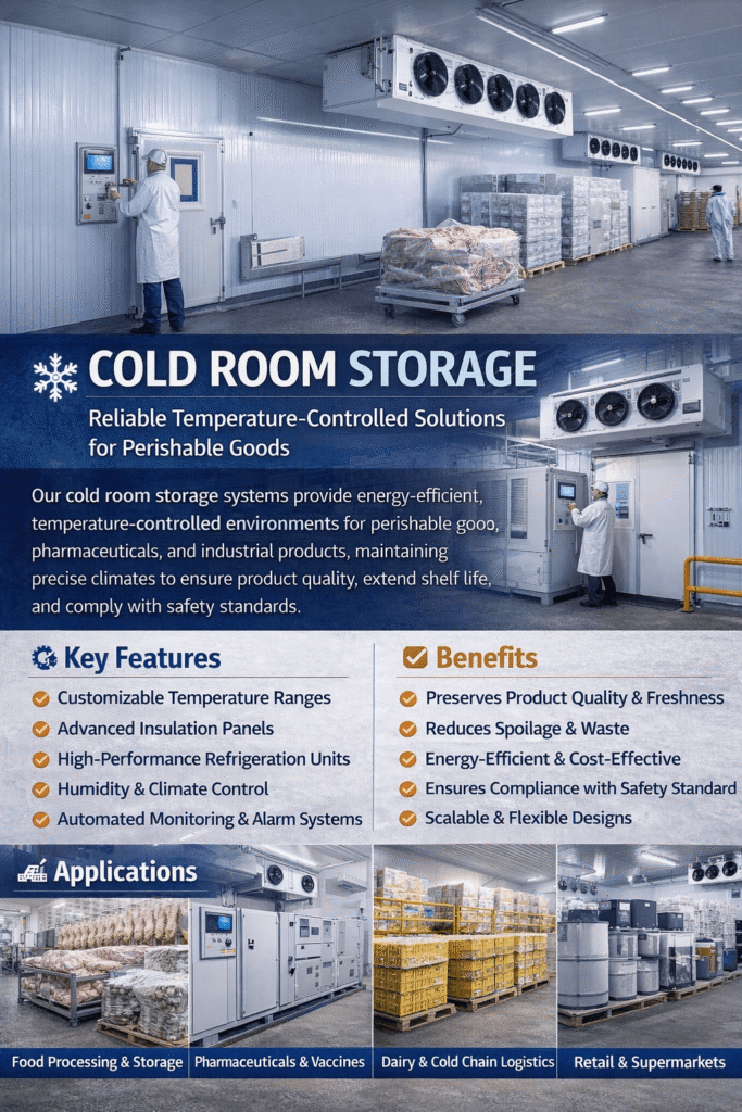 Our Cold Room Storage systems provide **reliable, energy-efficient, and temperature-controlled storage for perishable goods, pharmaceuticals, food products, and industrial materials. Designed for industrial and commercial use, these systems maintain precise temperatures to ensure product quality, extend shelf life, and comply with safety standards.
