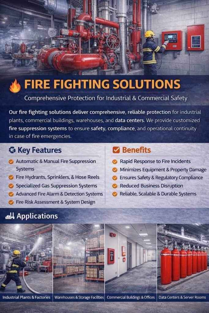 We provide comprehensive fire fighting solutions for industrial, commercial, and residential spaces. Our systems are designed to detect, control, and suppress fires efficiently, protecting lives, assets, and critical infrastructure. With advanced technology and expert installation, we ensure maximum safety and compliance with fire safety standards**.